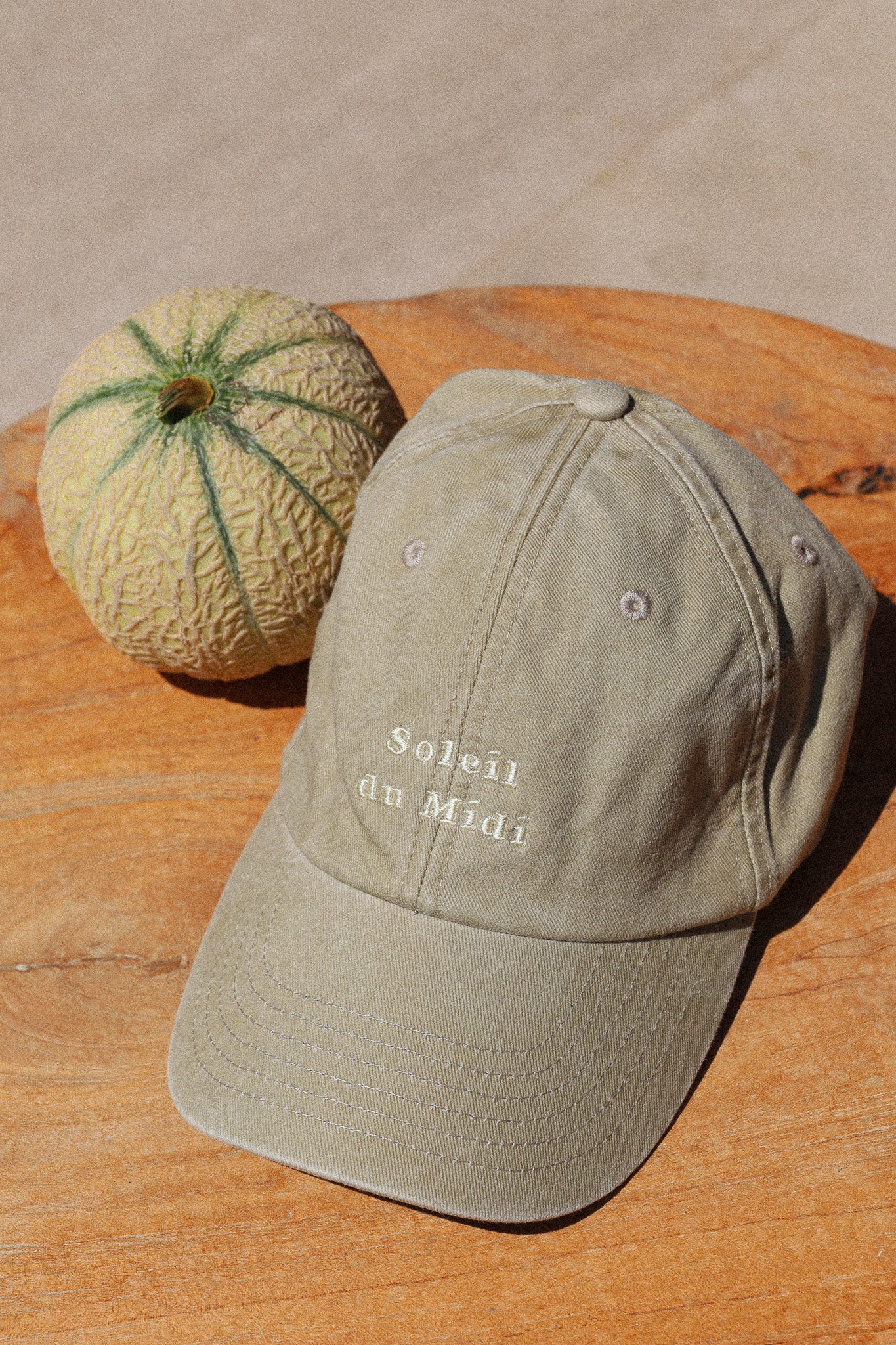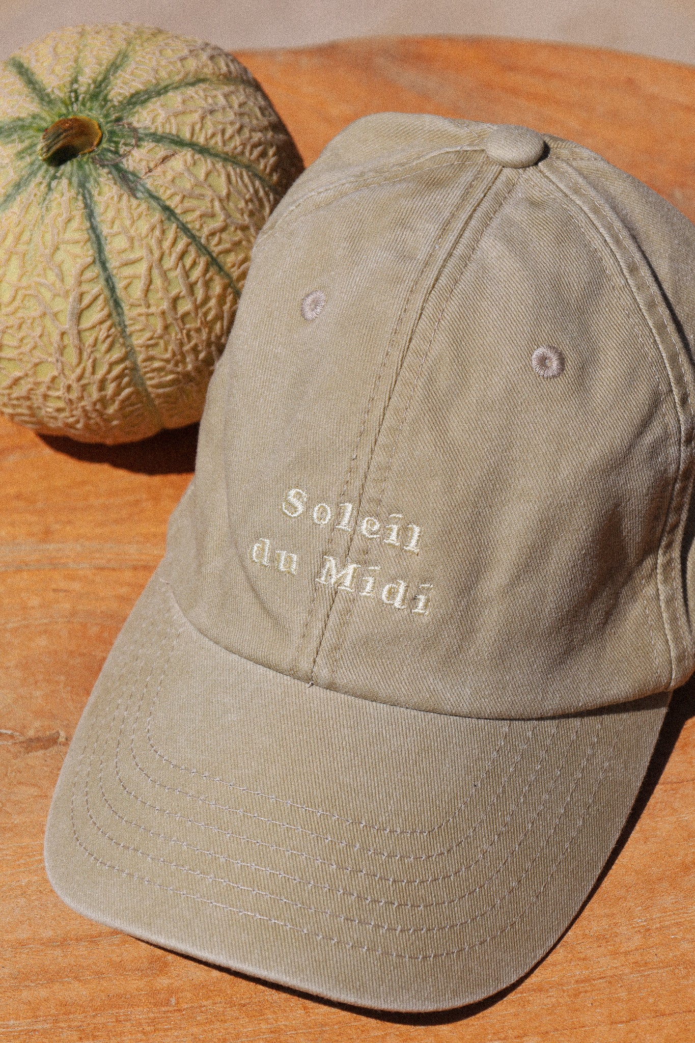 Beige „Midday Sun“-Kappe im Vintage-Stil. Weich, unisex und verstellbar mit beiger „Soleil du Midi“-Stickerei.