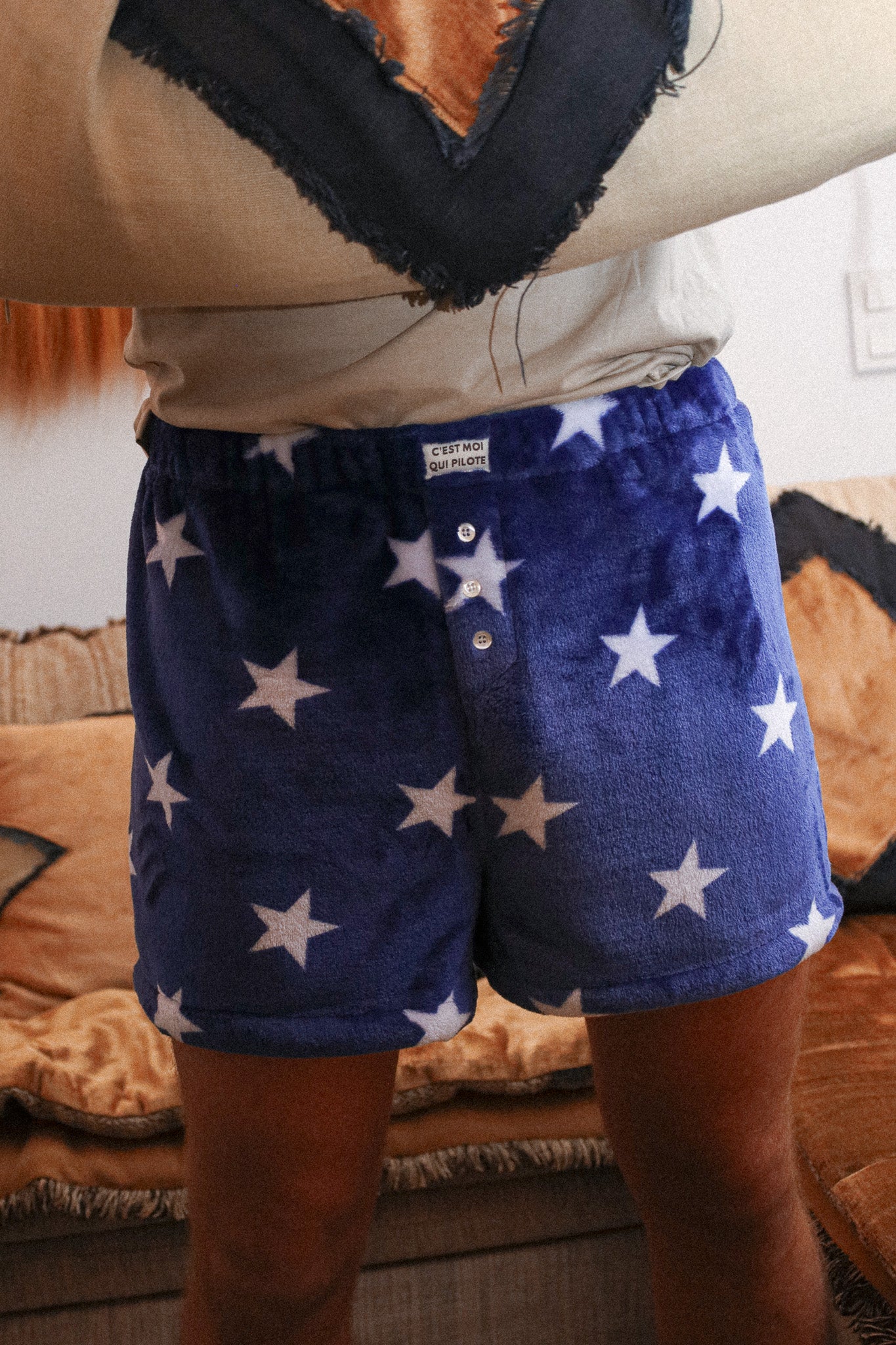 L'iconique caleçon C'est moi qui pilote se décline en pilou pilou, une matière moelleuse, douce, chaude et cocooning pour les jours où on ne veut plus sortir du lit.