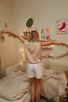 Unisex-Boxershorts: etwas länger, mit geschlossenem Hosenschlitz und geradem Schnitt auf der Rückseite, sodass sie drinnen, aber auch draußen wie Shorts „mit einem Twist“ getragen werden können. Der Clou ist dieser maskuline und doch feminine, lässige und doch schicke Stil!