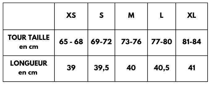 Pour un maximum de confort voici les mesures du tour de taille. À noter que l’élastique a été soigneusement sélectionné pour ne pas se détendre et conserver sa tenue dans le temps. La longueur varie peu d’une taille à l’autre, mais tu peux te référer au tableau des mesures pour choisir ce qui te convient le mieux.
