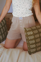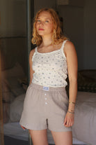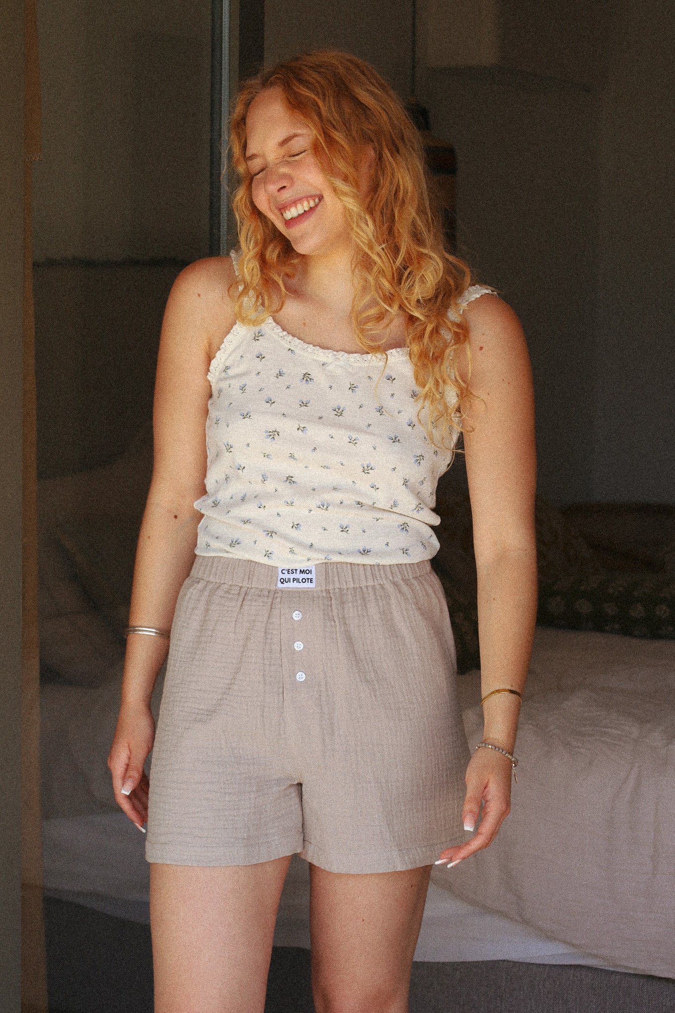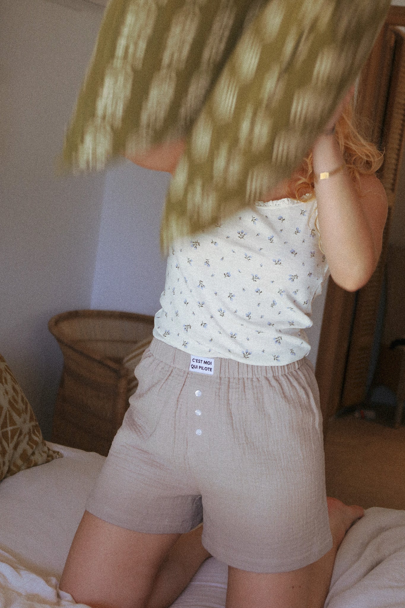 Unisex boxer shorts: slightly longer, with a closed fly and a straight cut at the back so they can be worn indoors or outdoors like shorts "with a twist". The twist is this masculine yet feminine, casual yet chic style!