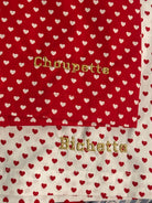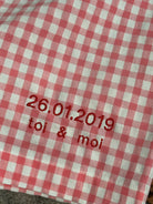 Texte possible : nom, prénom, initiales, dates, chiffre, ou autre texte... (pas de limite de texte en revanche, plus le texte est long plus la broderie risque d'être petite).