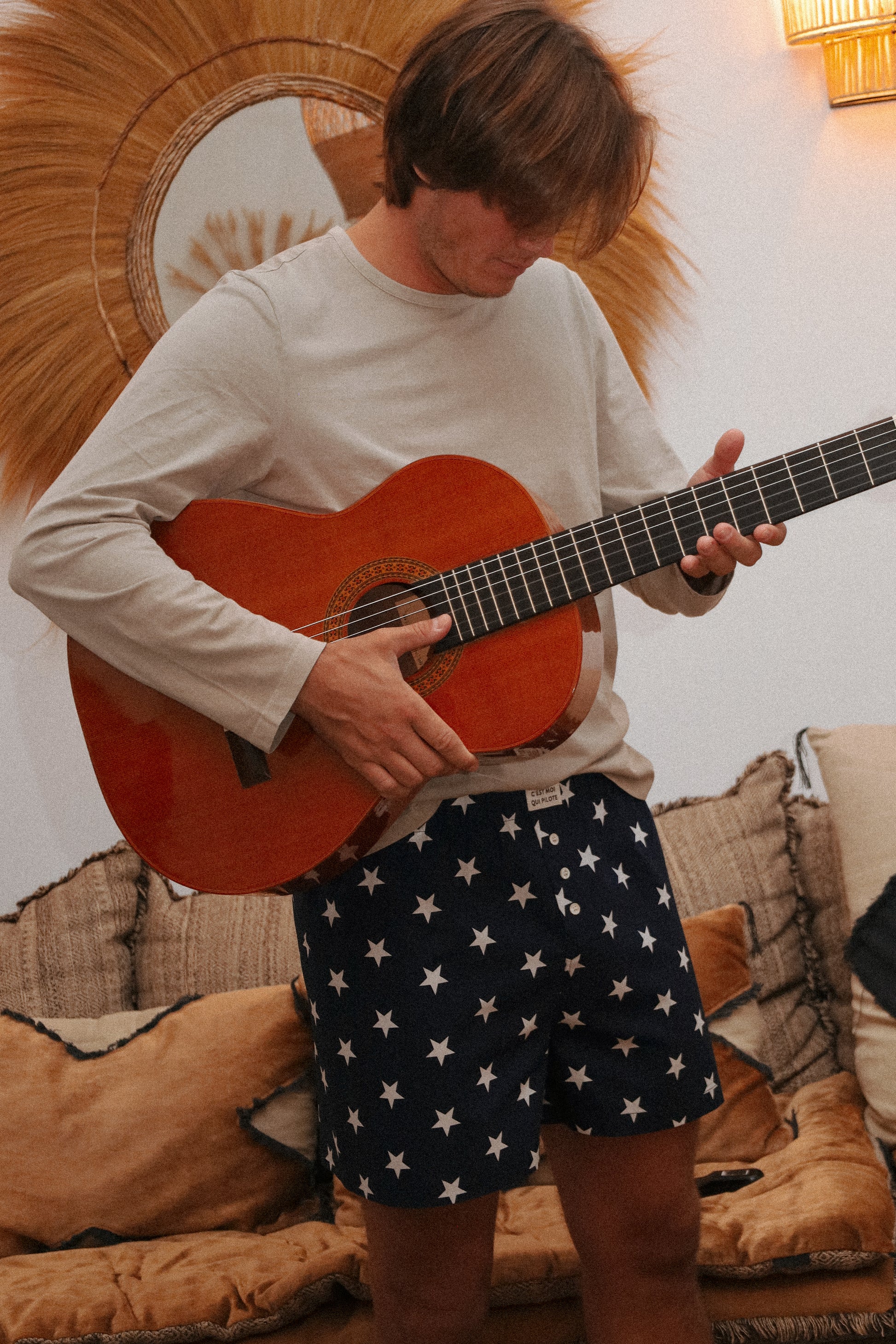 Les caleçons sont unisexes. Ils sont aussi un peu plus longs, avec une braguette fermée et une coupe droite au dos, pensés pour être portés aussi bien en intérieur qu’en extérieur, comme un short un brin décalé.