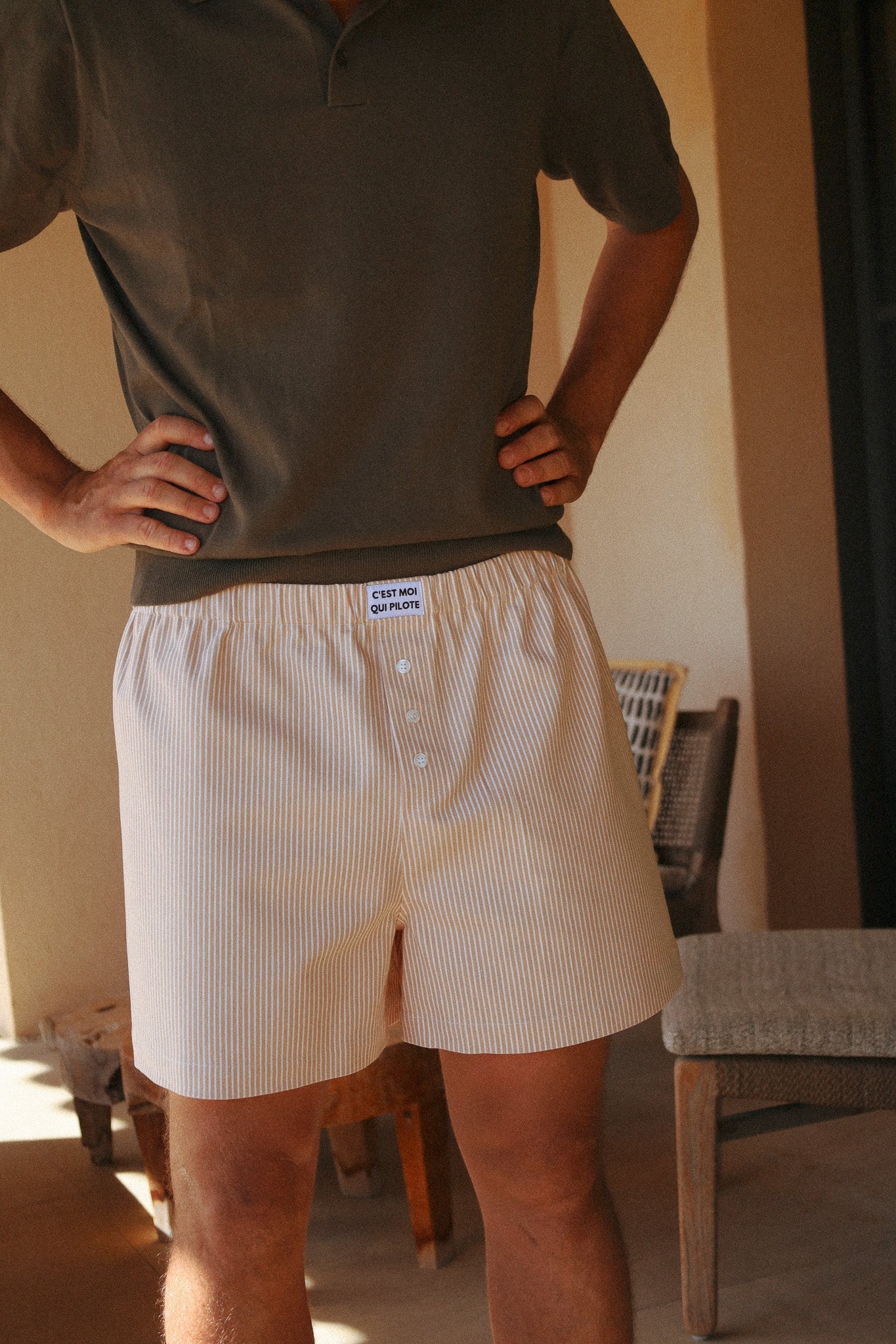 Les caleçons sont unisexes. Ils sont aussi un peu plus longs, avec une braguette fermée et une coupe droite au dos, pensés pour être portés aussi bien en intérieur qu’en extérieur, comme un short un brin décalé.